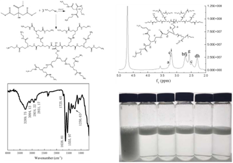 摘要:本发明公开了一种超支化聚合物,所述超支化聚合物以柠檬酸三甲酯为中心,胺基为端基;所述超支化聚合物的重均分子量Mw为10757,PDI为5.09。该超支化聚合物以柠檬酸三甲酯为中心,胺基为端基,其含有大量的亲水基团,能够显著降低油水界面张力,提高破乳效率,将其作为破乳剂,在常温条件下就可实现水包油乳液的高效破乳,在常温下破乳,50mg/L的超支化聚合物对柴油乳液的破乳效率可达到99.7%,该超支化聚合物的用量较少,破乳效率高。本发明还提供了一种超支化聚合物的制备方法和其作为破乳剂的应用。