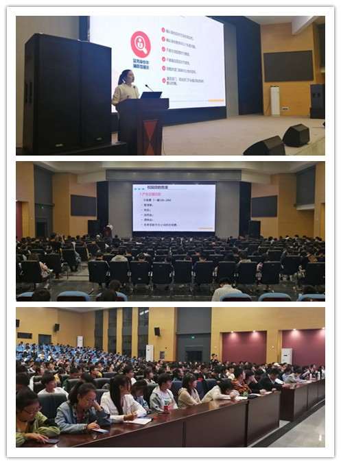 在讲述不良校园贷的危害时,侯聪老师结合五个方面提醒大家规避风险:一是借校园贷原因。刚上大一,同学们容易错误估计自己的还款能力,有些同学想做投资或者进行网络赌博;二是易中陷阱。因为校园贷款门槛低,许多老员工因为奢侈消费借款,加上校园贷的套路操作;三是传播途径。校园贷通过发广告,借款代理或APP推广;四是校园贷危害。在借校园贷后会产生巨额还款,从而对员工造成巨大心理压力。侯老师还讲述了为规避校园贷可采取的措施,学校方面强化网络安全知识宣传,并关注员工的消费情况,员工自身需杜绝滥贷,树立正确消费观。