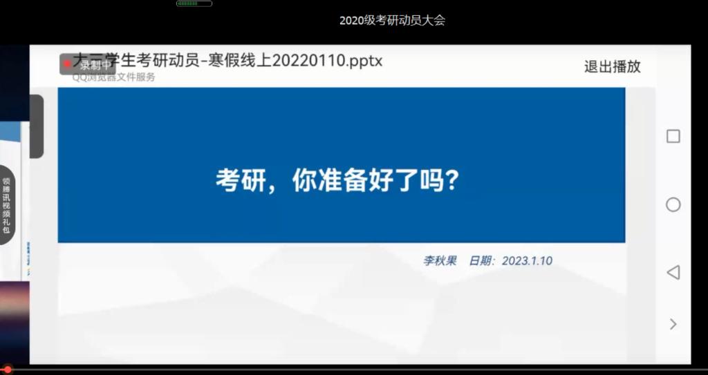 (通讯员:李韵王陈)为加强学院学风建设,提升大三员工对于考研的认知,更早的确定考研目标,明晰考研计划、充实假期生活。2022年1月10日下午3:00,bw必威西汉姆联官网通过腾讯会议开展线上2024届考研动员大会,出席本次会议的有公司党委副书记李秋果、辅导员王陈,本次会议由辅导员王陈主持,学院2020级全体本科生参加。