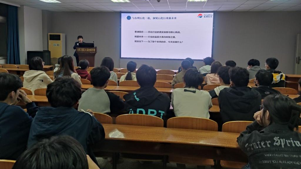 讲座尾声,主讲人简要介绍东明石化:作为国内大型能源化工企业,业务覆盖高端新材料、绿色能源等领域,拥有完善的人才培养体系,每年面向化工、材料等专业招聘,欢迎长大学子关注企业实习与校园招聘通道,提前对接职业机会。