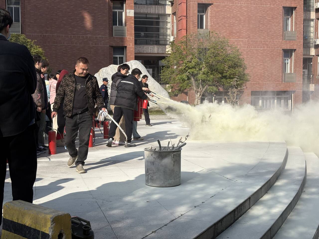 疏散环节结束后,学校保卫处万杨科长聚焦消防器材实操技能开展系统化教学。在14教室南广场的实操场地,保卫处老师详细演示了干粉灭火器、消防栓的核心构造与标准使用流程,逐一拆解“提瓶身、拔保险、握喷管、压手柄”的规范动作要领。针对研究生科研场景中可能遇到的电器火灾、化学试剂火灾等不同类型火情,专门讲解灭火器选型技巧与使用禁忌,明确“面对小火情切勿慌乱,保持1.5~2米安全距离,对准火焰根部持续喷射”的实操准则,并现场纠正常见操作误区。演示结束后,学子们分组轮流实操演练,工作人员全程一对一指导,确保每位同学都能亲身体验操作流程、熟练掌握实用技能。