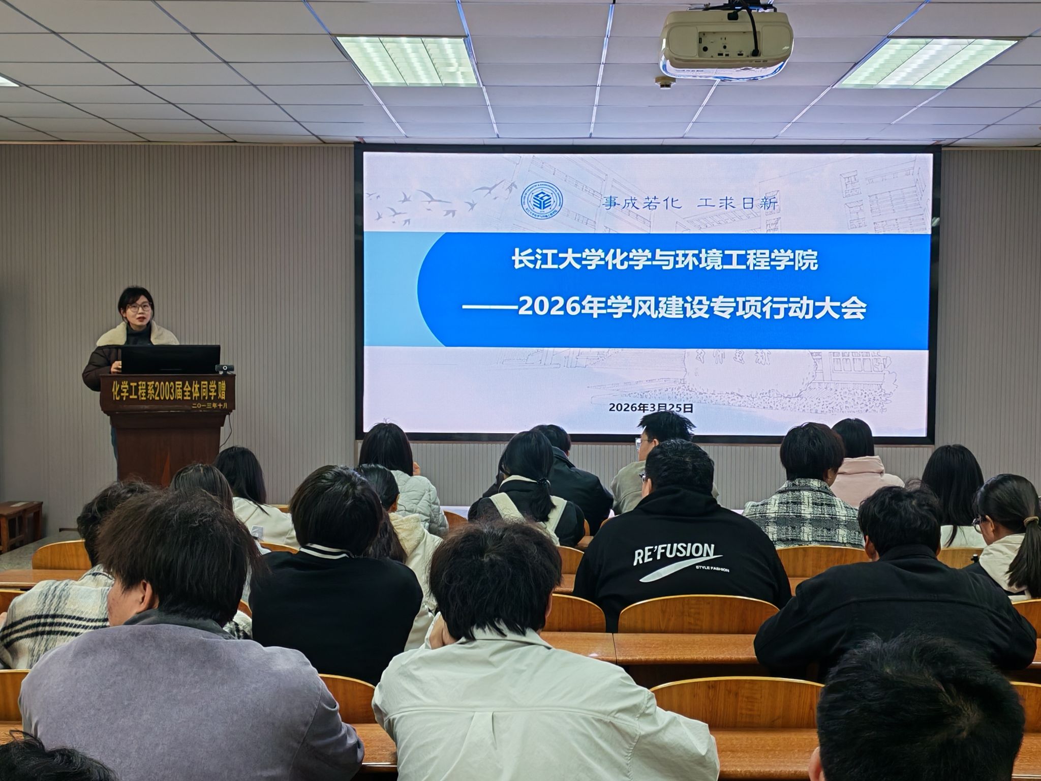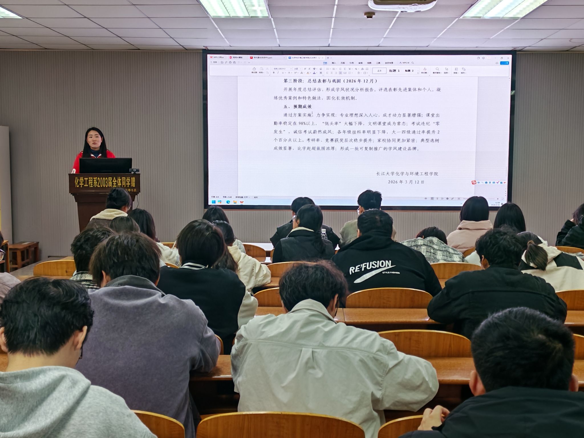 大会伊始,王娜老师围绕学院2026年学风建设专项行动工作方案,对学风建设作出系统部署,明确各个年级差异化建设重点,聚焦课堂规范、考风考纪等关键环节破解学业突出问题。其中,2024级以“转型·拓展”为核心,抓实课堂纪律、学业帮扶和科研竞赛;2023级以“选择·提升”为重点,推进考研备战、就业赋能和诚信教育。同时,会议强调,全体员工干部作为学风建设的组织者、推动者、示范者,需履行履职承诺、主动履职尽责、密切联系同学,带动班级形成比学赶超、互帮互助的良好氛围。
