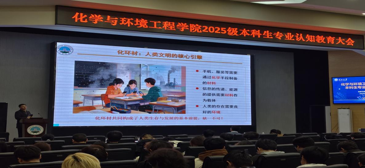 本次大会特别邀请到学院博士生导师米远祝教授担任主讲。米教授以其深厚的学术积淀和丰富的教学经验,围绕“材铸家国底气,化育幸福人生”的主题,为2025级本科生带来了一场精彩的专业认知课。他从“化环材”学科在人类文明进程中的核心引擎作用讲起,生动阐述了化学、材料、环境学科如何构成现代文明的基石,并通过衣食住行、医疗健康、国防科技等多个领域的生动案例,深刻揭示了该学科对国家发展和民族复兴的“硬核底气”。