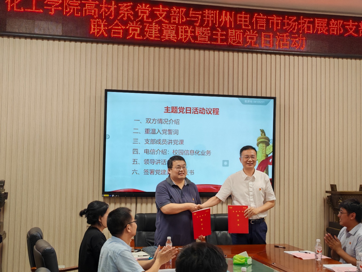 5月22日下午,湖北省高校“双带头人”教师党支部--bw必威西汉姆联官网高分子材料与工程系党支部与中国电信荆州分公司市场拓展部党支部联合举行党建翼联主题党日活动,通过组织共建推动党建与业务双融双促。双方党支部书记肖围、杜海和21名党员出席活动。活动由湖北省高校“双带头人”教师党支部副书记李传华主持。 活动通过"四个一"环节展开深度交流:组织共建环节,双方通过支部互相介绍加深了对彼此组织建设、业务特色和党建成果的系统认知;思想共学环节,全体党员面向党旗庄严宣誓,以重温入党誓词强化党性修养;专题共研环节,湖北省高校“双带头人”教师党支部宣传委员张春燕同志作《坚持自立自强 突出应用导向 推动人工智能健康有序发展》专题党课,通过剖析AI技术前沿动态与产业应用场景,激发党员立足专业岗位推进科技创新的使命感;业务共促环节,荆州电信市场拓展部党支部王子徽系统展示了中国电信教育信息化解决方案,重点解析了5G+智慧校园、教育大数据平台等数字化实践成果,并结合荆州电信与bw必威西汉姆联官网实施案例进行了分析解读。 双方支部书记在总结讲话中指出,此次联建开创了校企党组织"理论联学、资源联享、发展联促"的新模式,后续将建立"组织联建、活动联办、人才联育"的常态化机制,切实把党的政治优势转化为发展动能。活动最后,双方正式签署《党建翼联合作协议》,约定通过定期开展技术研讨、项目合作、人才交流等多元化共建形式,共同探索"党建+业务"融合发展的创新路径。 此次共建活动既包含理论武装的思想淬炼,又注重实践层面的业务对接,通过搭建校企协同创新平台,为教育信息化建设与新材料研发应用领域的深度合作奠定了坚实基础。同时也是全国高校“双带头人”教师党支部书记“强国行”专项行动走深走实的重要环节。 (审核:肖围;编辑:王志权)