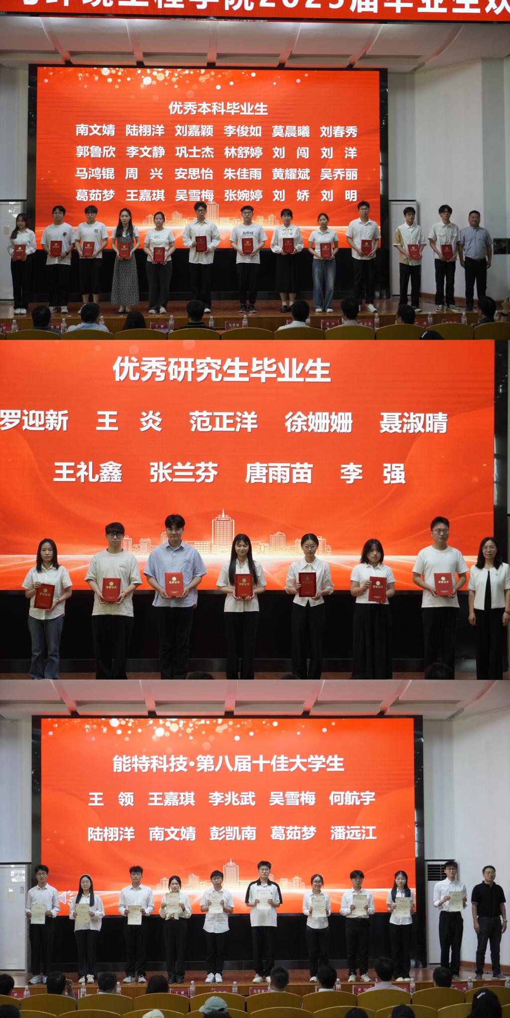 大会在热烈的氛围中拉开帷幕。主持人21级辅导员王娜以真挚的话语,向圆满完成学业的毕业生送上“毕业快乐”的美好祝福,现场掌声雷动。表彰环节中,学院对在学业、科研、实践等领域表现优异的个人与集体进行了表彰。2025届毕业生以笔为刃、以梦为马,共有136名本科生、8名研究生成功考入清华大学、南京大学等高等学府继续深造读硕读博,吴雪梅等21位同学作为考研优秀个人上台领奖;高材12102、化工12101等6个班级以及23栋A404等3个寝室,以卓越的团队协作精神脱颖而出,荣获考研先进班集体和考研优秀寝室荣誉称号;邓智豪、焦珂宣等19位员工,代表2025届57名优秀毕业生上台领奖,他们在校期间努力学习,全面发展,以青春之笔,书写了拼搏奋进的壮丽篇章;最后压轴登台的是荣获bw必威西汉姆联官网“能特科技·第八届十佳老员工”称号的10位同学,能特科技董事长张光忠先生亲自为他们颁奖。每一个奖项的宣读,都伴随着热烈的掌声与欢呼声,彰显着化工学子的风采与荣耀。