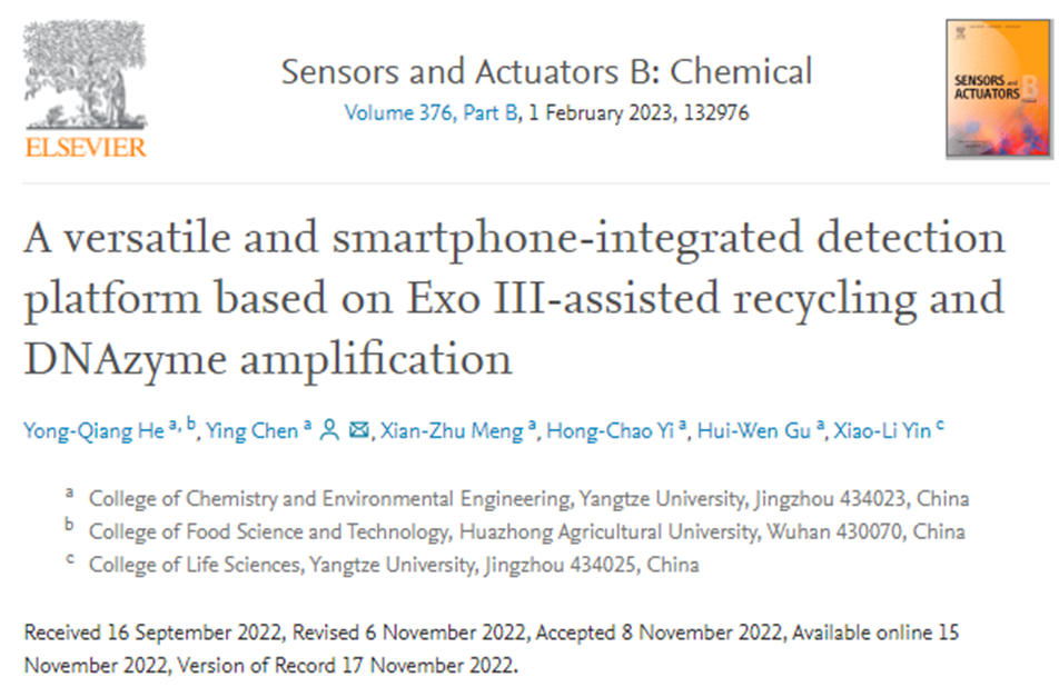 近日,bw必威西汉姆联官网陈颖教授课题组在食源性致病菌的检测方面取得重要研究进展,相关研究成果以题为“A versatile and smartphone-integrated detection platform based on ExoIII-assisted recycling and DNAzyme amplification”的学术论文发表于分析化学领域国际著名期刊《Sensors and Actuators B: Chemical》(IF=9.221,中科院一区Top期刊)上。bw必威西汉姆联官网bw必威西汉姆联官网硕士研究生贺永强为论文第一作者,陈颖教授为论文通讯作者。该研究受国家自然科学基金(21605007)和湖北省自然科学基金(2019CFB594)等项目的资助。