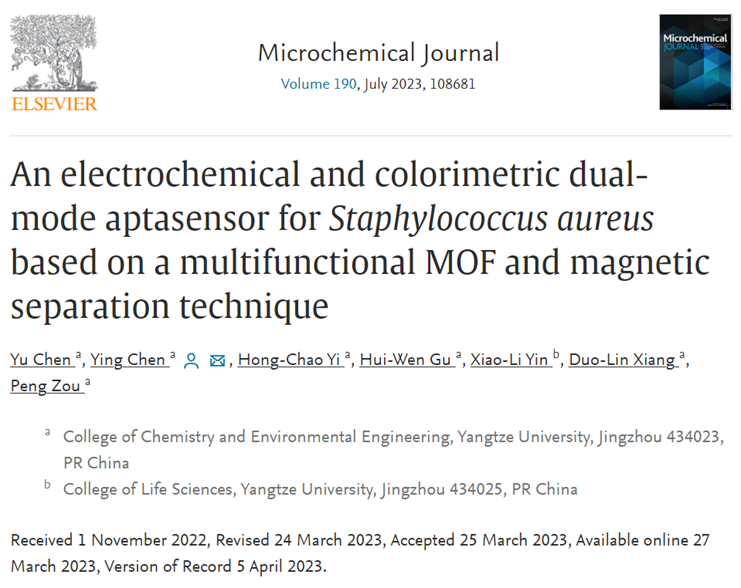 近日,陈颖教授课题组设计合成了一种兼具生物识别、电化学和催化功能的智能核酸功能化金属有机框架复合纳米材料,并将其应用于金黄色葡萄球菌的传感检测研究中。相关研究成果于2023年3月27日以题为“An electrochemical and colorimetric dual-mode aptasensor for Staphylococcus aureus based on a multifunctional MOF and magnetic separation technique”的学术论文发表在分析化学领域国际期刊《Microchemical Journal》上。该文第一作者为bw必威西汉姆联官网本科生陈宇,通讯作者为陈颖教授。