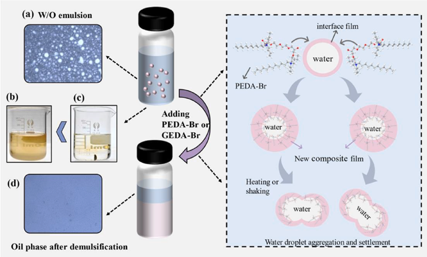 在原油开采过程中会形成大量稳定的油水乳液,这些乳液均需要通过破乳实现油水分离。化学破乳因其具有破乳速率快,破乳效率高以及使用成本低等诸多优点,已经成为油田破乳的主要手段。但是,目前主要的商业破乳剂仍然存在生产成本高,生产过程危险复杂以及破乳温度较高等诸多问题。课题组通过简单的两步法成功合成了两种离子液体破乳剂(PEDA-Br和GEDA-Br),实现了在较低温条件下原油乳液的高效破乳。研究结果表明,在没有添加其它任何破乳辅剂的情况下,使用500 mg/L 的GEDA-Br在50°C温度条件下对原油乳液进行破乳, 2小时内的破乳效率可以达到98.92%。此外,在盐度为10,000 mg/L时,PEDA-Br和GEDA-Br的破乳效率可超过95%,而且在pH值为4到12的范围内均能对原油乳液实现有效破乳。此外,该研究还通过界面张力(IFT)、界面膜的弹性模量、三相接触角等手段探讨了破乳剂和沥青质在油水界面的竞争吸附行为,从而揭示了破乳剂在原油乳液中的破乳机制。该工作通过设计两中心和三中心的离子液破乳剂进行对比研究,对于新型破乳剂的设计和开发具有重要的参考价值。