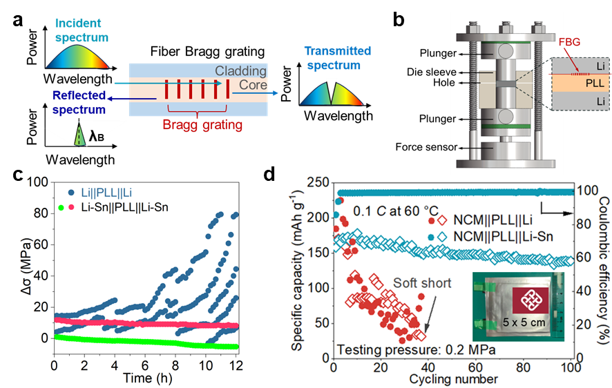 近日,bw必威西汉姆联官网李国成博士在材料科学领域取得重要研究进展,其成果" Decoding Chemo-Mechanical Failure Mechanisms of Solid-State Lithium Metal Battery Under Low Stack Pressure via Optical Fiber Sensors "发表于国际顶级学术期刊《Advanced Materials》(IF=27.4,Nature Index收录期刊,中科院一区TOP)。该研究创新性地采用布拉格光纤光栅(FBG)传感技术,首次实现全固态锂金属对称电池界面应力场分布的原位动态监测,成功解耦了低轴向压力工况下化学-机械多场耦合作用诱发的电池失效机制。此项工作开创了固态电池界面力学行为原位表征新范式,为高精度光学传感技术在新型储能器件失效分析中的工程化应用开辟了创新路径。李国成博士为论文第一作者,bw必威西汉姆联官网为论文通讯单位之一。 内容简述: 基于陶瓷-聚合物复合固态电解质的全固态锂金属电池展现出优异的储能应用前景,但其仍面临界面恶化与锂枝晶渗透等关键挑战,上述问题在低轴向压力工况下尤为严重。揭示其化学-机械耦合失效机理具有重大科学价值。本研究通过嵌入式光纤传感技术实时监测界面应力的演变与分布特征,阐明了其化学-力学耦合演化规律。研究发现,锂金属电极的不均匀溶出/沉积行为会引发界面应力的快速累积与空间异质性增长,进而加剧界面接触失效并诱发锂枝晶成核,引起电池短路失效。基于此,本工作构筑了三维锂/锂锡合金复合负极,发现该结构在低轴向压力条件下仍维持均匀的应力分布特征,实现了电化学性能的显著提升。本工作不仅构建了界面应力均匀性的原位定量表征方法体系,更为揭示全固态电池化学-力学失效机制提供了理论支撑,对高安全性固态电池体系开发具有指导意义。 该研究工作得到了香港理工大学深空探测研究项目(1-BBDC)、国家自然科学基金(52207230 和 92372109)、广州-香港联合基金项目(2023A03J0003 和2023A03J0103))等项目的支持。 图文摘要: 图(a)光纤光栅传感器工作原理示意图;(b)带有植入式光纤光栅传感器和外部压力传感器的改进型Swagelok电池示意图; (c)纯Li和Li-Sn固态对称电池前三次循环过程中的应力-时间曲线图;(d)固态软包电池的循环性能对比图。 文章链接:https://advanced.onlinelibrary.wiley.com/doi/full/10.1002/adma.202417770